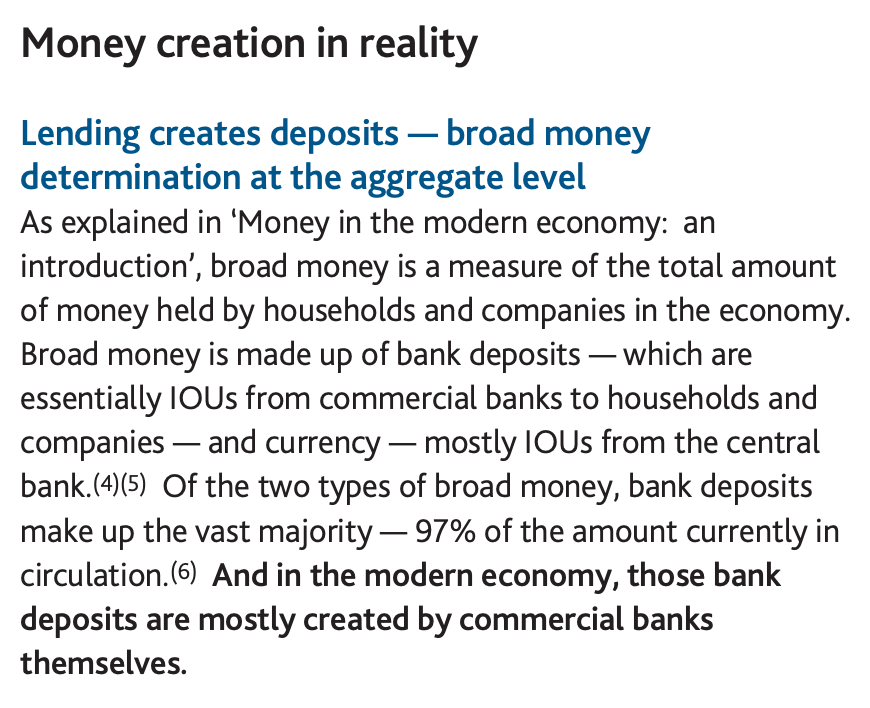 I’ll start with two of the most basic ideas, both of which are supported by official documents describing central bank and commercial banks in multiple G-7 countries, including Canada, the UK, Germany, Australia, New Zealand, and Norway, to name a few.